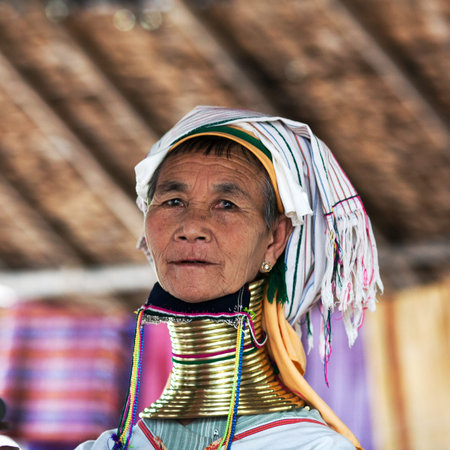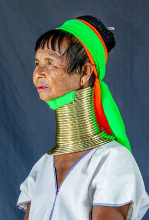 Portrait of an old Padaung woman in traditional dress and with metal rings around her neck. February 12, 2019, Myanmar.