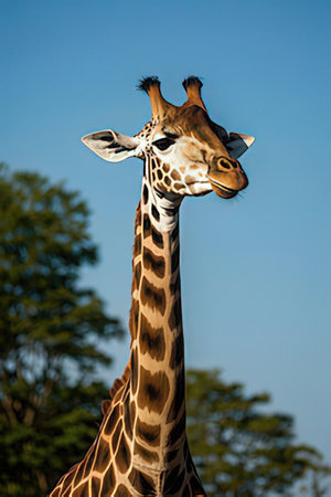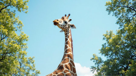 A captivating image of a giraffe, its long neck reaching towards the clear, vibrant blue sky.