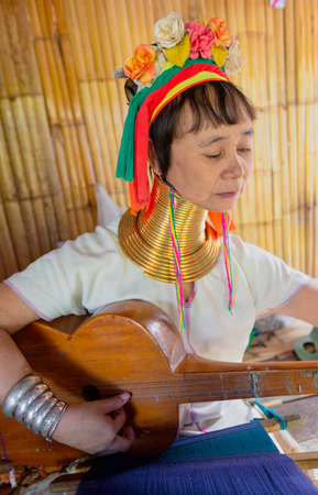 Long Neck Woman weave cloth in front her house in tribal village Northern Thailand.
