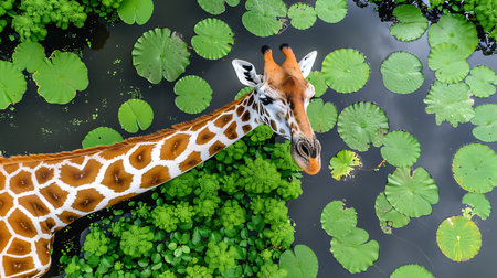 Aerial view of a female African giraffe swimming in a lake