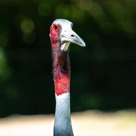 closeup of red crowned crane head beak red-white neck