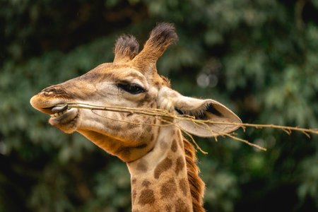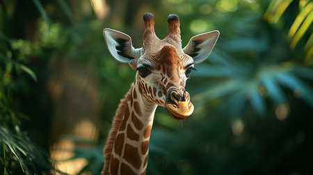 Giraffe is eating a leaf in a jungle. The giraffe is looking at the camera