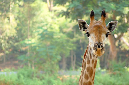 Portrait of a giraffe on the green nature background.
