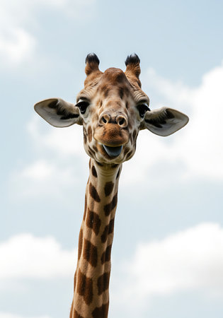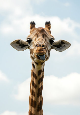 Close-up of a giraffe's head and neck with its tongue sticking out, set against a light blue sky with scattered clouds. Generative Ai