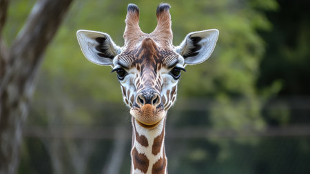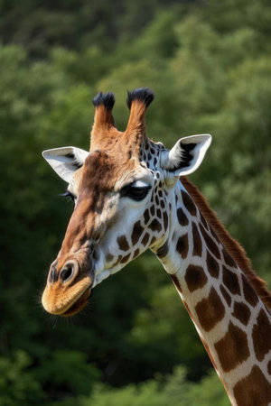 closeup portrait of a giraffe on a background of green foliage