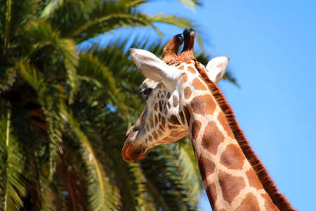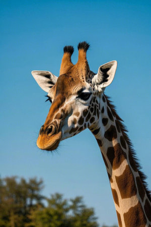 Beautiful spotted African giraffe against blue sky