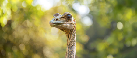 A young cassowary's head is captured in a close-up shot, showcasing its large, dark eyes and distinctive beak. The background is a blurred image of green foliage, creating a sense of depth and ambiance. The bird's head is slightly tilted, giving the impression of curiosity or alertness.