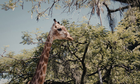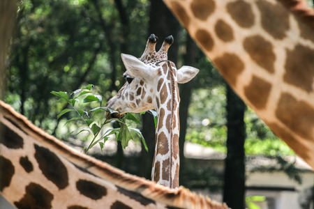 Giraffe eating leaves in the jungle. Wild animal in nature.
