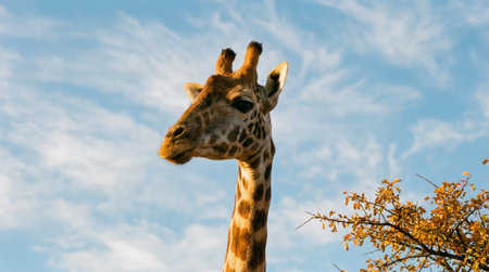 A low angle shot of a giraffes head and long neck. The animal is set against a beautiful blue sky with white clouds and warm sunlight illuminates its features.