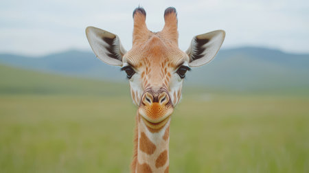 Close-Up Portrait of a Playful Giraffe Smiling Against a Lush Green Background with Soft Focus and Scenic Mountains in the Distance for Nature Lovers