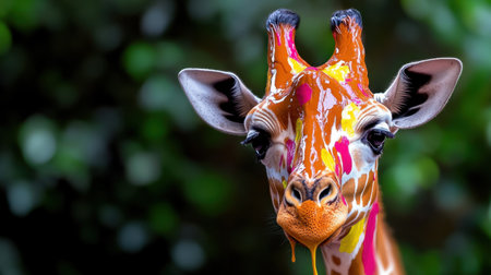 Abstract giraffe head with glossy paint drips, bold colors contrasting a dark background