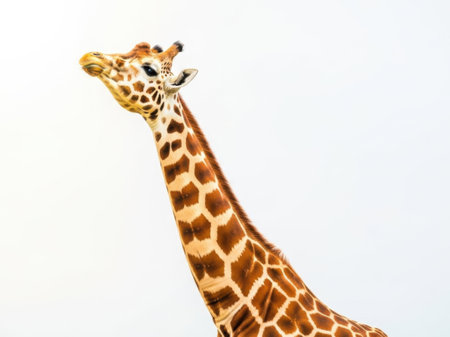 This image features a close-up of a giraffe's long neck and head, isolated on a white background. The giraffe's distinctive spotted pattern is clearly visible, and the image is well-lit, highlighting the unique texture and coloration of its skin.