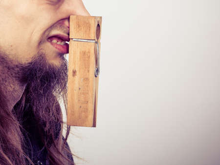 Man with clothespin clip peg on his nose. Young long haired guy feeling unpleasant odor stink. Bad smell concept.