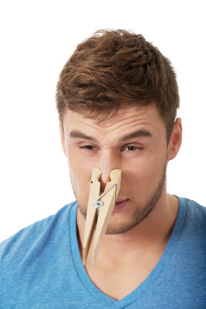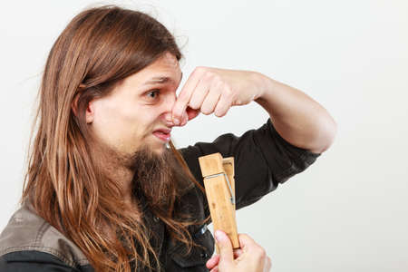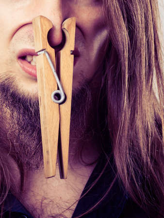 Man with clothespin clip peg on his nose. Young long haired guy feeling unpleasant odor stink. Bad smell concept.