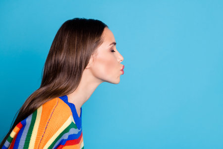 Profile side photo of charming girl send air kiss copyspace her boyfriend on 14-february date wear pullover isolated over blue color background