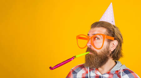 Bearded man in party hat blow noisemaker. Happy guy in big glasses in birthday cone cap. Copy space.