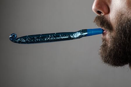 Man with Beard with a Party Horn Blower on Gray Background