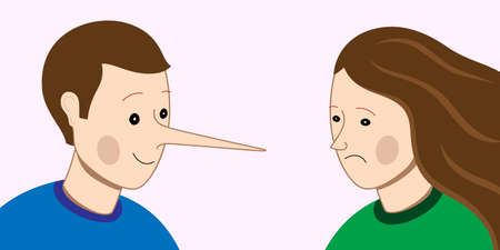 Liar man with a long nose, cheating on partner woman. Dishonesty in relations, concept vector illustration