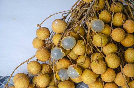 Opened flesh of sweet fruits bundle of ripe longan, sweet thai fruits