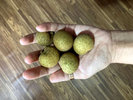 Longan fruit in hand on wooden background. Fresh longan fruit.