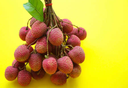 Closed up group of Lychee pink color with leave fresh fruit on yellow background
