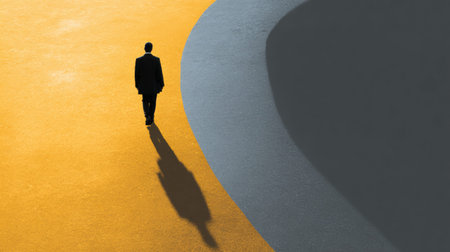 A person in formal attire walks away, facing a split path that represents stability and change amid contrasting light and shadow.