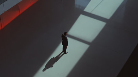 Business professional standing alone in a modern office environment with dramatic lighting effects