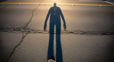A long shadow of a person is cast onto a cracked asphalt road, lit by the low sun of sunrise or sunset. The person's feet are at the bottom of the frame, creating a first-person perspective of standing on the road.
