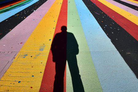 Shadow of a man on a colorful pedestrian crossing in Paris, France