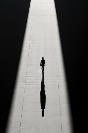 A person's silhouette and its exaggerated shadow cast on a city pavement, illuminated by a single light source.
