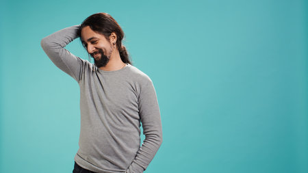 Portrait of shy man putting hand on head, feeling ashamed, isolated over studio shot. Self conscious person feeling insecure while seeing crush, feeling need to express emotions.