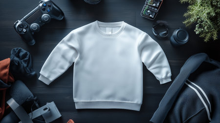 A minimalistic white sweatshirt displayed on a dark wooden surface with gaming controllers and accessories nearby
