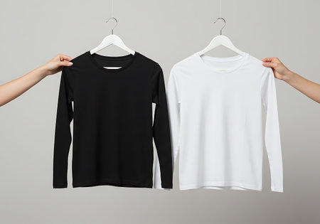 Hands hold up a black and a white long sleeve shirt against a plain background, showcasing basic apparel options.