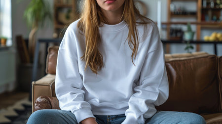 Mockup of a woman in a blank white sweatshirt, minimal background, ideal for customization or branding purposes