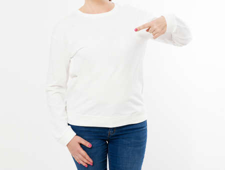 White long sleeve t-shirt on a middle aged woman in jeans and pointed hand isolated, front , mockup