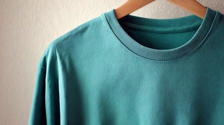 Green t-shirt on wooden hanger, closeup of photo