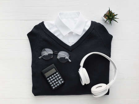 Stylish school uniform, eyeglasses, headphones and calculator on light wooden background