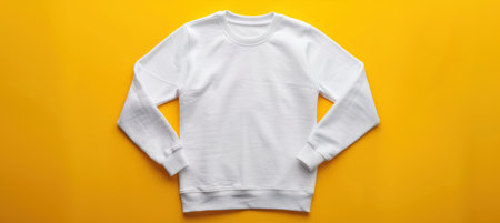 A blank white sweatshirt laid out flat against a vibrant yellow backdrop, ideal for showcasing customizable text or graphic designs. this setup highlights the garment's potential for personalized branding or creative projects.