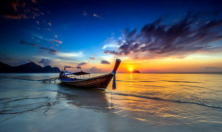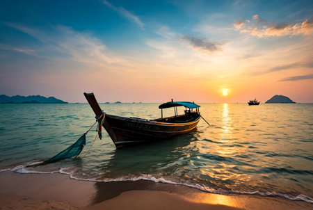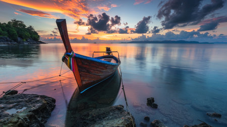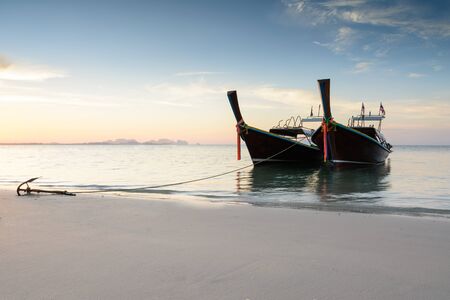 Inspiring travel photography, a sunset on the Thai coast, with a traditional fishing boat in the sand.