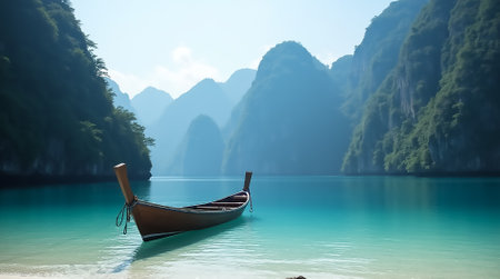 A wooden boat floats peacefully in shimmering turquoise waters, framed by towering green mountains. The setting is serene under a bright midday sky.
