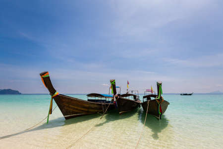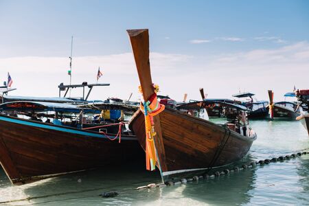 Traditional Thai wooden boats near sunny Thai beach on the Phi Phi island