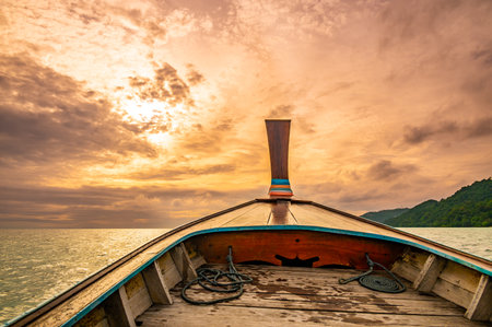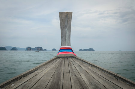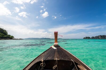 Traveling in Thailand. Amazing view from over Thai traditional wooden longtail boat travel on the sea tropical island with scenery of beautiful sea and sky.