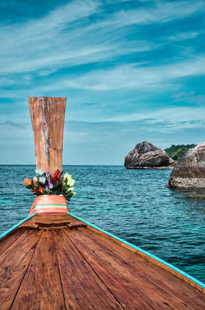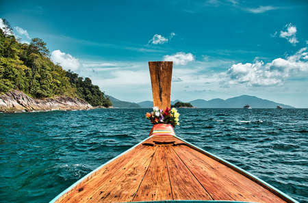 Thai wooden head longtail boat heads toward the tropical Andaman shores at Thailand andaman