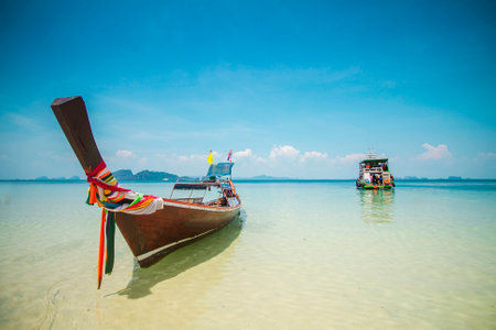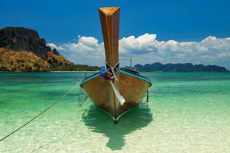 Long tail boat on water at famous Thale Waek beach in Krabi, Thailand. Typical image of Thailand vacation. Tropical paradise with pure sea, white sand and blue sky. Summer travel background.