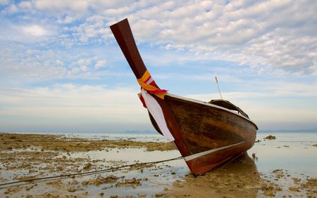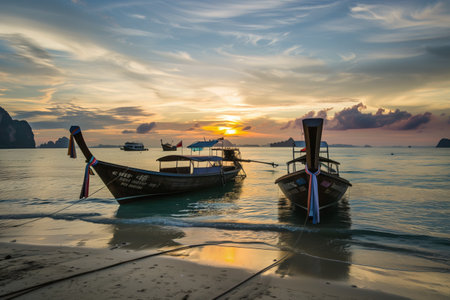 Long tail boat on the beach at sunset, Krabi, Thailand