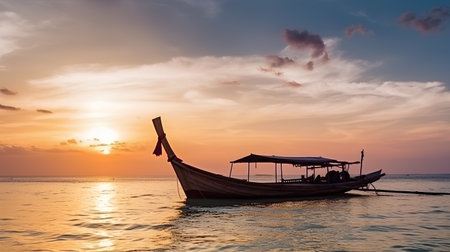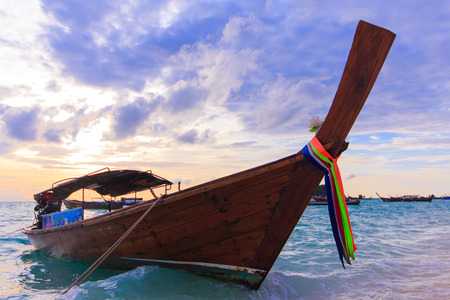Traditional Thai longtail boat on the sea with sunset sky background.