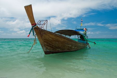 Traditional Thai wooden boat in Koh Lipe, Thailand with colorful textile tied around the high prow moored in shallow sunlit water offshore in a lagoon or sheltered bay in a summer travel concept