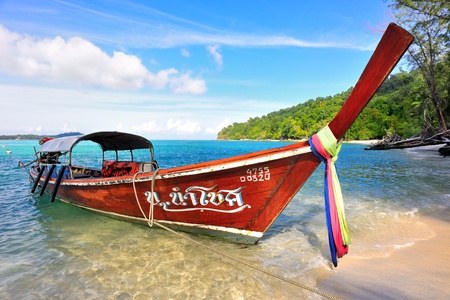 Long tail boat on white sand beach on tropical island, Koh Lipe, Andaman sea, Thailand