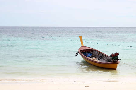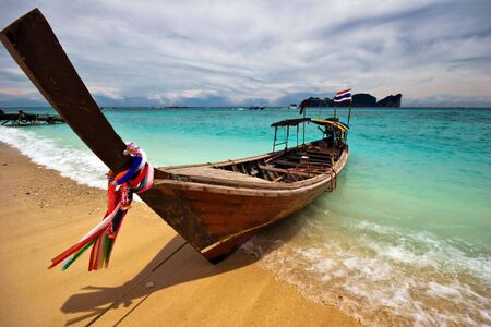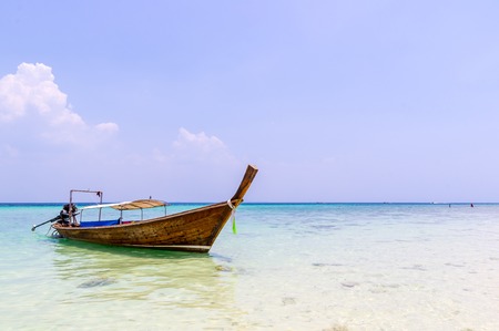 Boat near the white sand tropical beach. Andaman sea. Province Krabi. Koh Phi Phi island. Kingdom Thailand