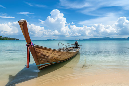An ocean view of traditional long tail wooden boat on tropical seascape beach AI Generative